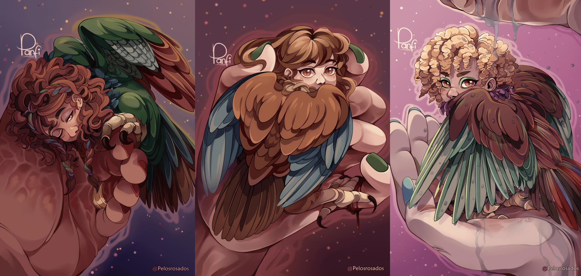 What would it be like to have a little harpy as a pet?Like an agapornis, these fantastic creatures would be energetic beings with an affectionate nature, always seeking closeness to their owners. However, much like these birds, their interaction could be dangerous, leading to accidents and unpredictable situations.My goal is to reinterpret elements of mythology through symbolism. By merging these myths with the agapornis, I aim to create a visual narrative that blends the fantastical with the real, highlighting the everyday coexistence between humans and birds.Each harpy has a distinct personality, and the images reflect how living with them —full of energy and affection— could be dangerous for humans, much like the unpredictability of having wild animals as pets.